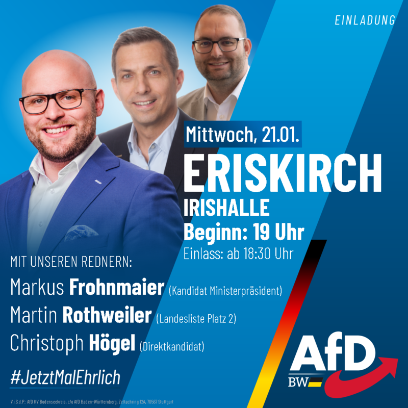 Am Mittwoch, den 21. Januar 2026 um 19 Uhr lädt die AfD Bodensee herzlich ein zu unserer Wahlkampfveranstaltung in die Irishalle, Mariabrunnstraße 16, Eriskirch mit