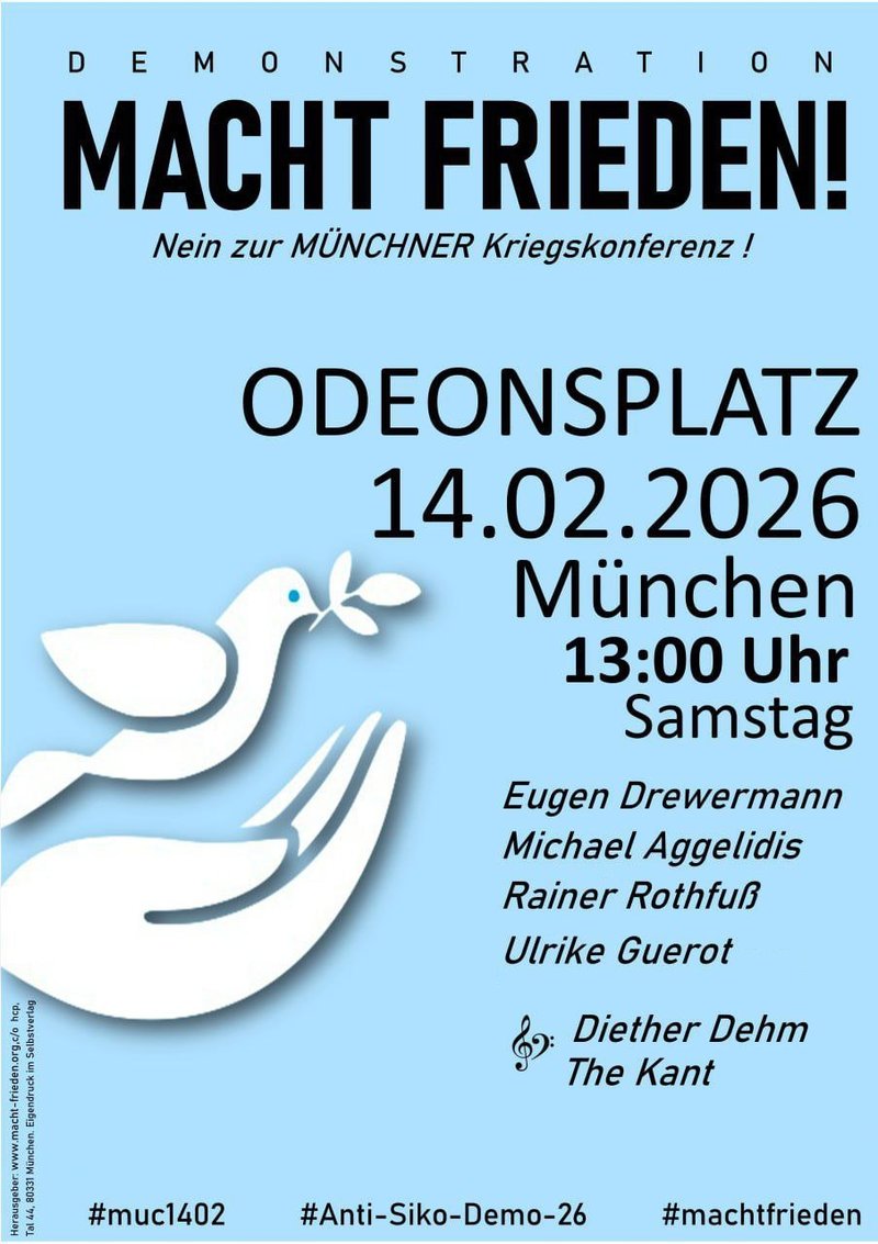 Am Samstag, den 14. Februar 2026 um 13 Uhr demonstrieren wir für Frieden auf dem Odeonsplatz in München. Dort sprechen