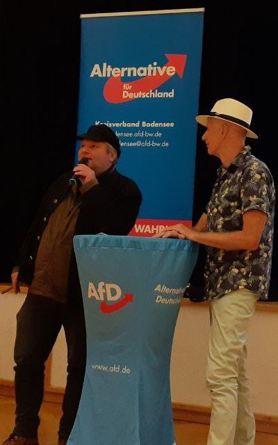 Zu Beginn der gut besuchten Veranstaltung im Bürgerhaus Kluftern führen der Vorsitzende des AfD Kreisverbandes, Detlev Gallandt, und sein Stellvertreter, Andreas Piekniewski, mit einem humorvollen Dialog in die Thematik der Energieversorgung ein.